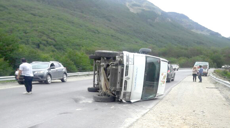 El furgón siniestrado quedó cruzado sobre la ruta, dirigiéndose al lugar personal policial de la Comisaría 3era y bomberil del Cuartel 2 de Abril, de Ushuaia.