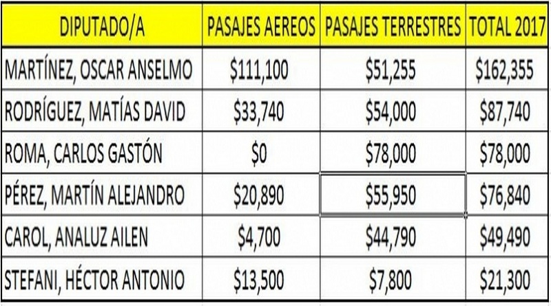 Por su parte, Gastón Roma (PRO) no realizó canjes por pasajes aéreos, aunque sí $78 mil en terrestres. En tanto, el recién llegado Héctor «Tito» Stefani (PRO) recibió $21.300, Martín Pérez (FPV) $76.840, Matías Rodríguez (FPV) 87.740 y Analuz Carol $49.490.