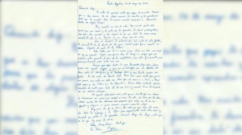 Está fechada el 16 de mayo de 1982 en Puerto Argentino, y en ella mi papá me dice cómo le gustaría que yo creciera, con qué valores y con qué objetivos. Sin saber cuál sería su destino me dio los consejos que un papá le da a su hijo mientras crecen juntos, los que él me hubiese dado con el paso del tiempo. O tal vez sí lo sabía y por eso lo hizo. Espero haber cumplido algunos.