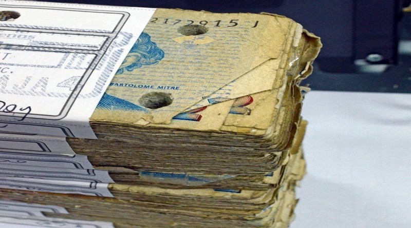 Vigentes desde 1992, los billetes de dos pesos salen de circulación con un avanzado estado de deterioro. Tras recibirlos, los bancos los perforan y los entregan al Banco Central para su destrucción.