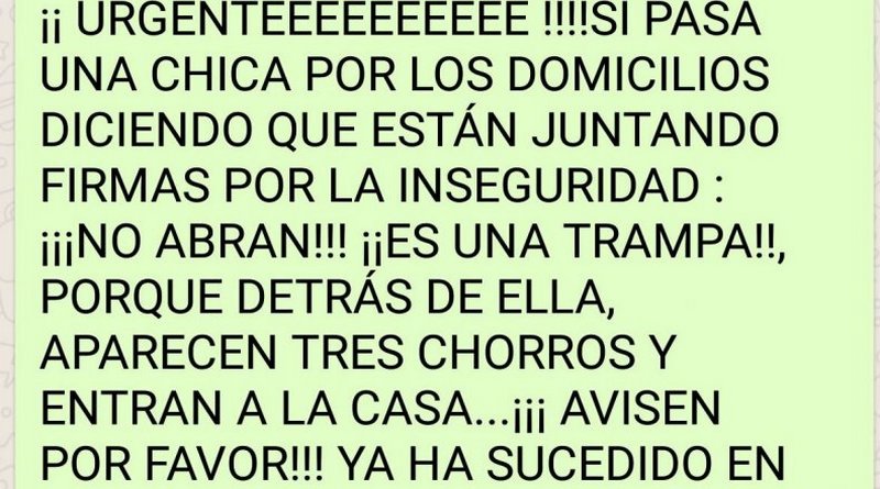 “URGENTE. Si pasa una chica por los domicilios diciendo que está juntando firmas por la inseguridad: ¡No abran! ¡Es una trampa!” Así comienza el mensaje que alerta sobre una nueva modalidad de robo en la ciudad. Sin embargo, desde la Unidad Regional local aseguraron que hasta el momento, no hubo denuncias al respecto.