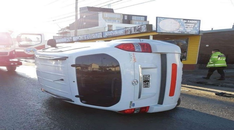 Un choque y posterior vuelco se registró en la calle Karukinka entre Goleta Florencia y Alfonsina Storni de la ciudad de Ushuaia. allí el conductor de una camioneta marca Hyundai modelo Tucson, patente IES-104, identificado como Joel Ibarrola, impacto contra un vehículo, un Fiat, modelo Palio, patente AA 237 TE, color rojo, se encontraba perfectamente estacionado y termino volcando quedando la Tucson recostada sobre uno de sus laterales en el medio de la calzada.