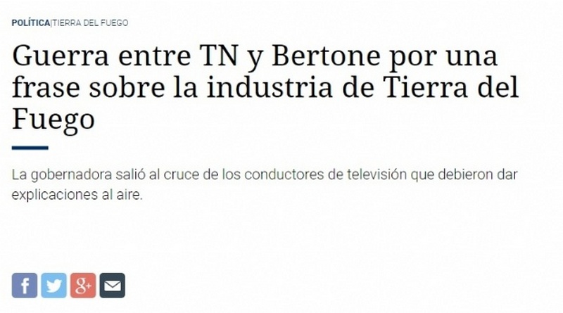 El medio El Destape se refirió a los ataques mediáticos del canal TN que fueron denunciados en redes sociales por la propia gobernadora de la Provincia y publicó una noticia titulada ‘Guerra entre TN y Bertone por una frase sobre la industria de Tierra del Fuego’.