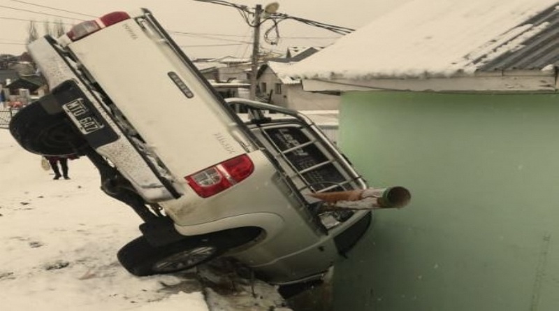 Producto del estado resbaladizo de la calzada y bajo la nieve imperante, el conductor habría perdido el control de la pick-up, la cual quedó peligrosamente colgando y se apoyó en una pared lateral de este domicilio, propiedad del Sr. Omar Aguilar (36).