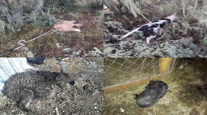 La primera alerta se produjo detrás de la chacra El Bagual, ubicada en el ingreso de la localidad de Tolhuin. Allí fueron encontrados tres perros ahorcados y dos en un sector más alejado tirados con golpes en la cabeza.
