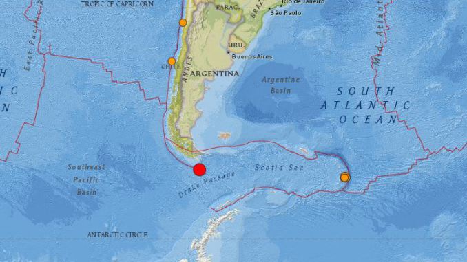 El movimiento ocurrió a las 3:54:15 de la madrugada del lunes y fue ubicado en el océano, a 312,9 kilómetros (194 millas) al sur-sureste de Ushuaia, Argentina y 552 kilómetros (342 millas) con dirección sur-sureste de Punta Arenas, Chile.