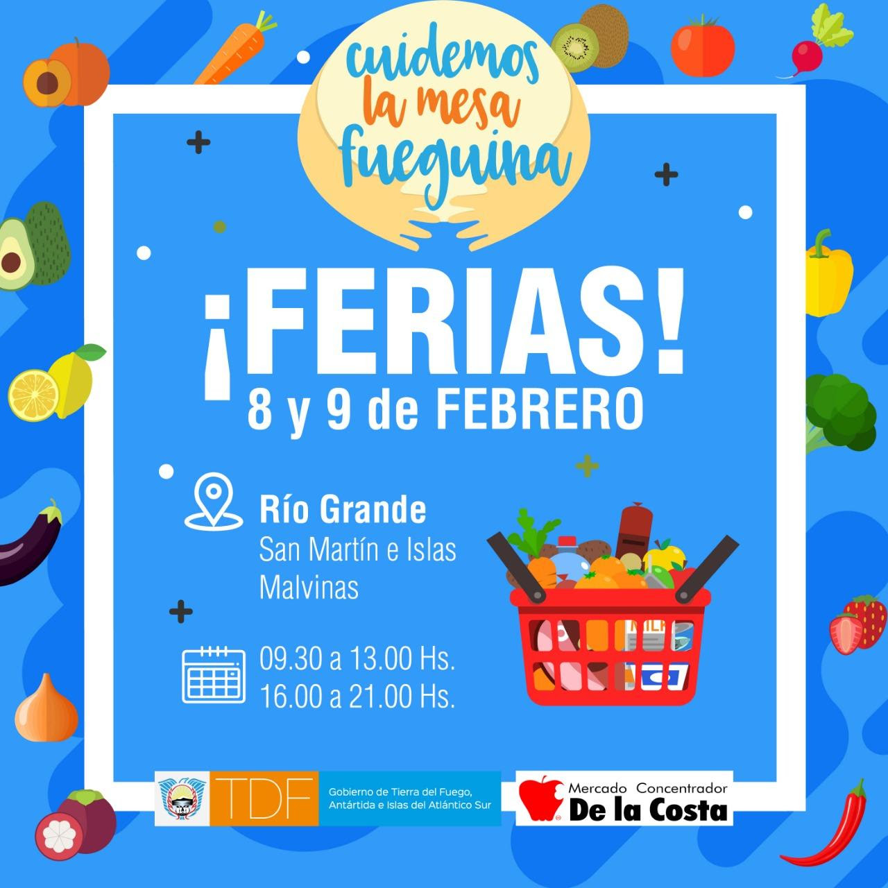 En Río Grande, la sede de la feria será también el Mercado Concentrador de la Costa, ubicado en San Martín e Islas Malvinas, durante este viernes 8 y sábado 9 de febrero, en el horario de 9.30 a 13 y de 16 a 21, con productos congelados, lácteos, bebidas, frutas y verduras (por kilo), carnicería (pieza entera al vacío), limpieza del hogar y cuidado personal, a precios muy convenientes.