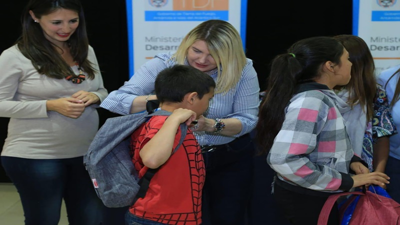 La gobernadora Rosana Bertone, junto a la ministra de Desarrollo Social, Paula Gargiulo, hicieron entrega -este martes en el IPRA de Río Grande- de kits escolares niños, niñas y adolescentes de esa ciudad.