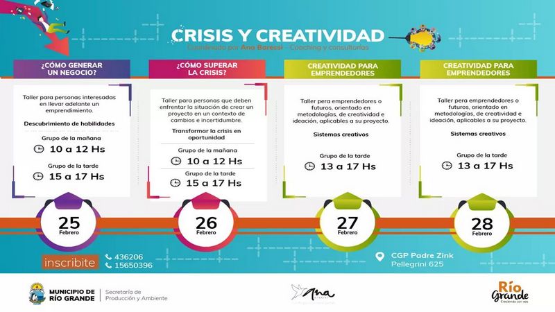 El Municipio de Río Grande, a través de la Dirección de Desarrollo Local de la Secretaría de Producción y Ambiente, llevará adelante un curso denominado ‘Crisis y Creatividad’ que estará a cargo de la Lic. Ana Baressi, coordinadora de coaching y consultorías. La jornada se realizará desde el 25 al 28 de febrero en el CGP Padre Zink (Pellegrini 625).