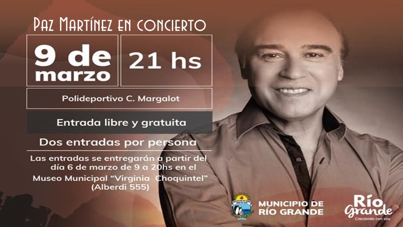 Al respecto, la licenciada Lucia Rossi, directora de Cultura del Municipio de Río Grande, indicó que “este sábado 9 de marzo a partir de las 21 horas, en el Polideportivo Carlos Margalot del Barrio Chacra II vamos a contar con la presencia del Paz Martínez”.
