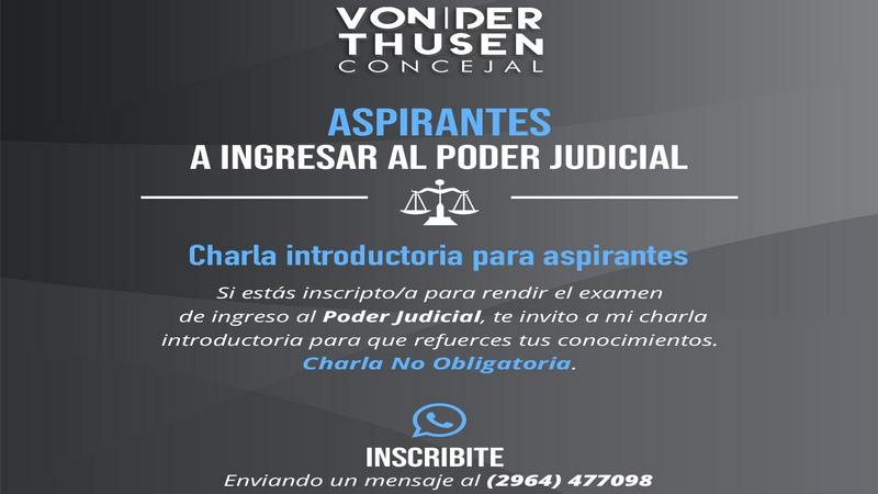 En este contexto, von der Thusen expresó que “si bien es una charla que no forma parte del cronograma oficial del Poder Judicial, considero que es importante poder acompañar a todos los riograndenses que tienen la esperanza de poder ingresar al Poder Judicial, y junto a otros dos abogados, nuestro objetivo es poder compartirles nuestra experiencia y también que aprovechen del encuentro para evacuar las dudas e inquietudes que tengan”.