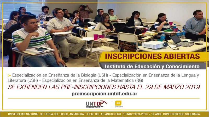 La Universidad Nacional de Tierra del Fuego, Antártida e Islas del Atlántico Sur, a través de su Secretaría Académica, informa que se resolvió prorrogar hasta el 29 de marzo las inscripciones 2019 para los Posgrados en Enseñanza de la Matemática, de la Biología y la Lengua y Literatura, que dicta el Instituto de Educación y Conocimiento (IEC).