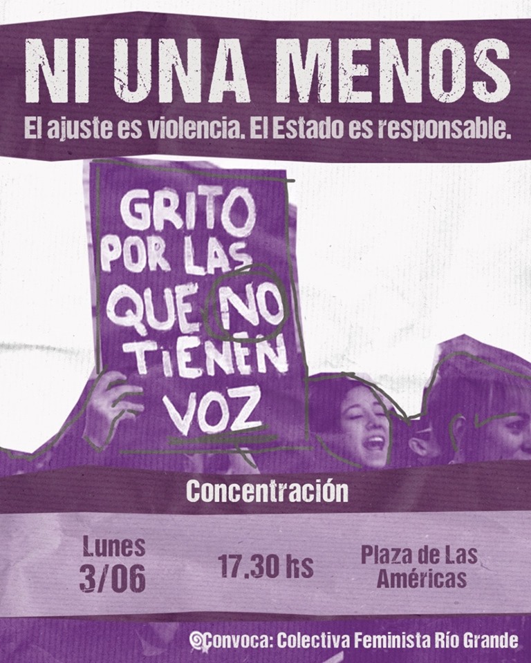 La Colectiva Feminista de Río Grande invita a participar de las actividades que se realizarán en el marco de la convocatoria “Ni una menos” bajo el lema nacional “El ajuste es violencia. El Estado es responsable”. Las mismas comenzarán el día domingo 2 de junio en instalaciones de la Universidad Nacional de Tierra del Fuego, Thorne 302, a partir de las 21 horas. Allí se realizará una velada artística con presentaciones de danza, música, teatro, audiovisuales y poesía. Desde la organización invitan a concurrir con comida y bebidas sin alcohol para compartir entre los y las asistentes.