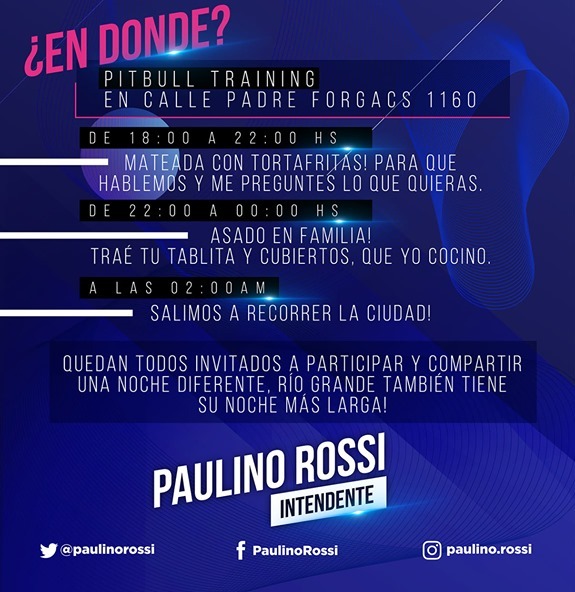 La jornada maratónica también tendrá horario nocturno, ya que luego de la cena, Paulino Rossi saldrá a recorrer lugares de la ciudad: “En nuestros lugares que forman parte de la cultura riograndense vamos a poder mirarnos a las caras y hablar sobre el proyecto de ciudad que tenemos para Río Grande, nos vemos el finde”, cerró.