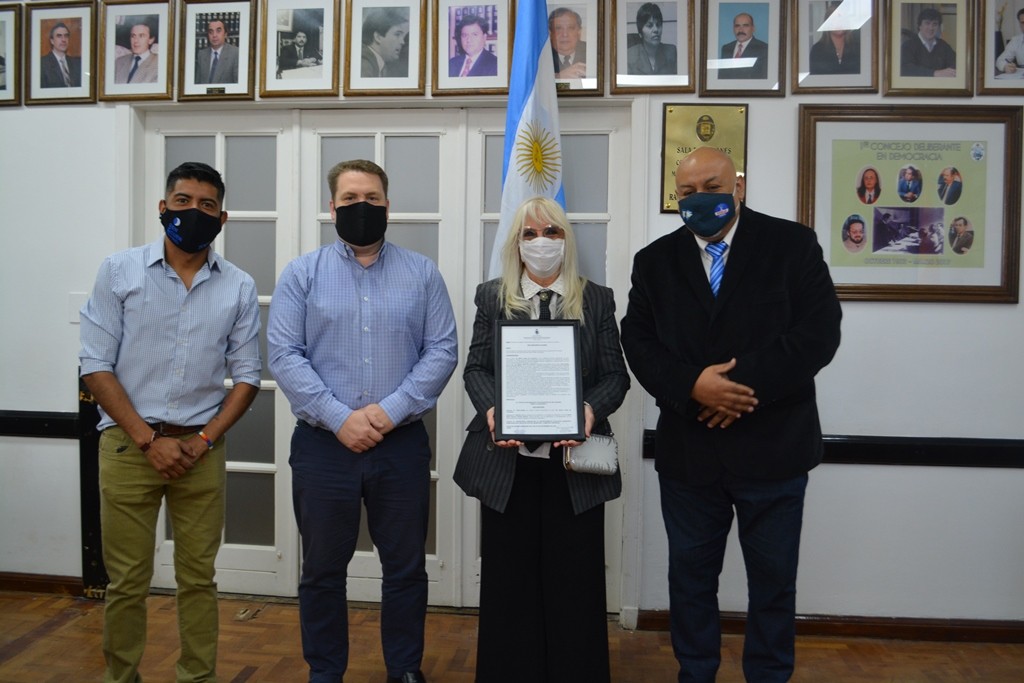 La entrega se efectuó en el recinto de sesiones del Concejo Deliberante con la presencia del presidente de la institución, Raúl von der Thusen y los Concejales Walter Campos y Javier Calisaya y la escritora María Betty Herrera Verdón Molina.