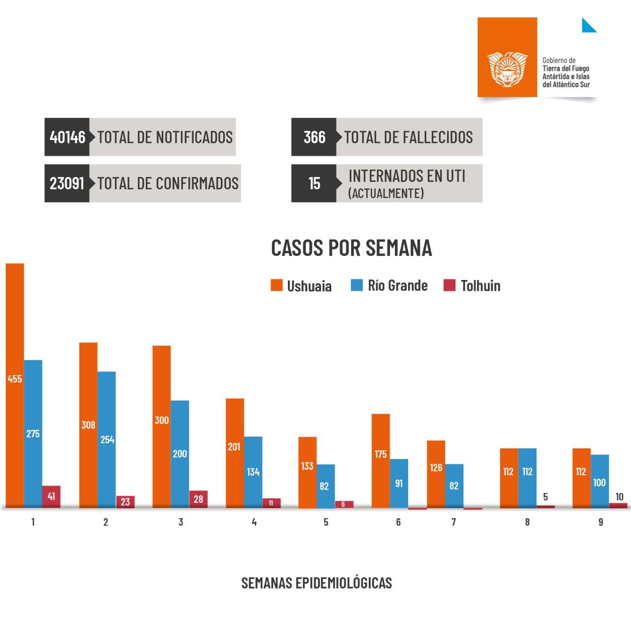 En la última semana se detectaron 112 casos nuevos en Ushuaia, 100 en Río Grande y 10 en Tolhuin. Al día de la fecha hay 15 internados en UTI en toda la Provincia.