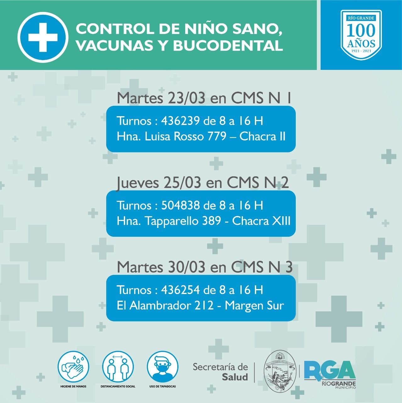 El Municipio de Río Grande informó que a partir de este, martes 23 de marzo, comienzan en los Centros de Salud Municipales los controles médico/odontológicos para el ingreso escolar, tales como: circuito integral de control de salud en niño sano; control de calendario nacional de vacunación y control bucodental .