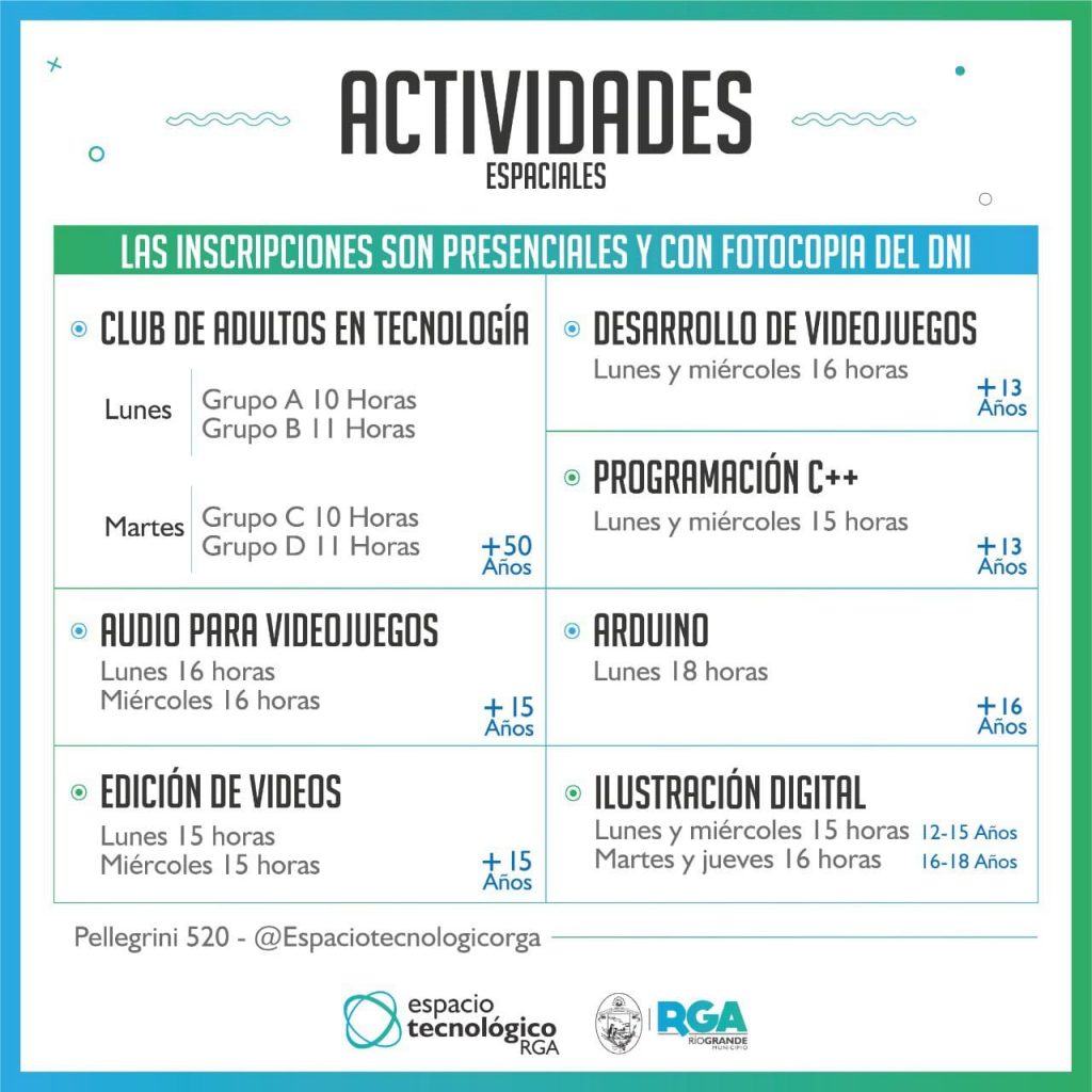 La Secretaría de Gestión Ciudadana, a través del Espacio Tecnológico RGA, lanzó “Actividades Espaciales”, una nueva propuesta que incluye un Club de Adultos en Tecnología, audio y desarrollo de videojuegos, edición de videos, programación e ilustración digital.