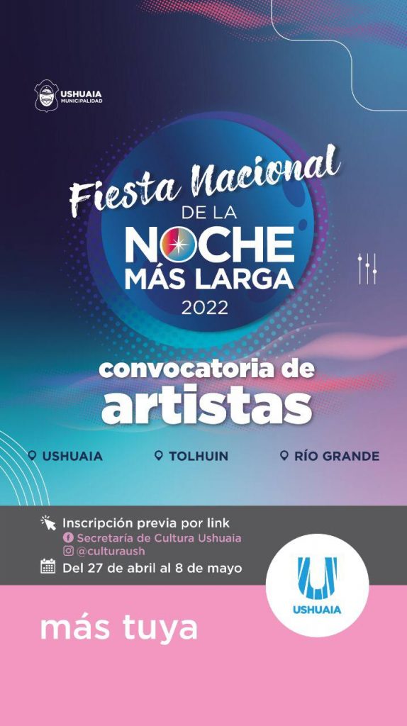 Molina informó que las y los artistas locales de Ushuaia, Tolhuin y Río Grande podrán inscribirse a través del link https://forms.gle/uWEpyEAk6X6yweKc7, desde el 27 de abril y hasta el 8 de mayo”.