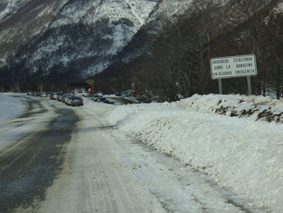 La entrada del centro invernal fueguino Cerro Castor conocido en todo el mundo por sus virtudes únicas, mantiene una característica que poco tiene de nueva y que se transforma cada año en peligro latente: ante la falta de plazas para estacionar, sus clientes dejan sus vehículos»tirados» a la vera de la Ruta 3.