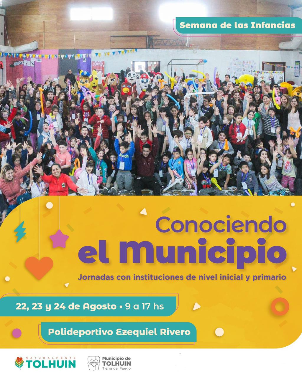 «Conociendo el Municipio» estará disponible desde el lunes 22 hasta el viernes 26 de agosto, en el horario de 9:00 a 17:00 horas, el Polideportivo Ezequiel Rivero será el escenario donde jardines y escuelas de Tolhuin disfrutarán de una serie de juegos y actividades especialmente pensadas para las infancias tolhuinenses.