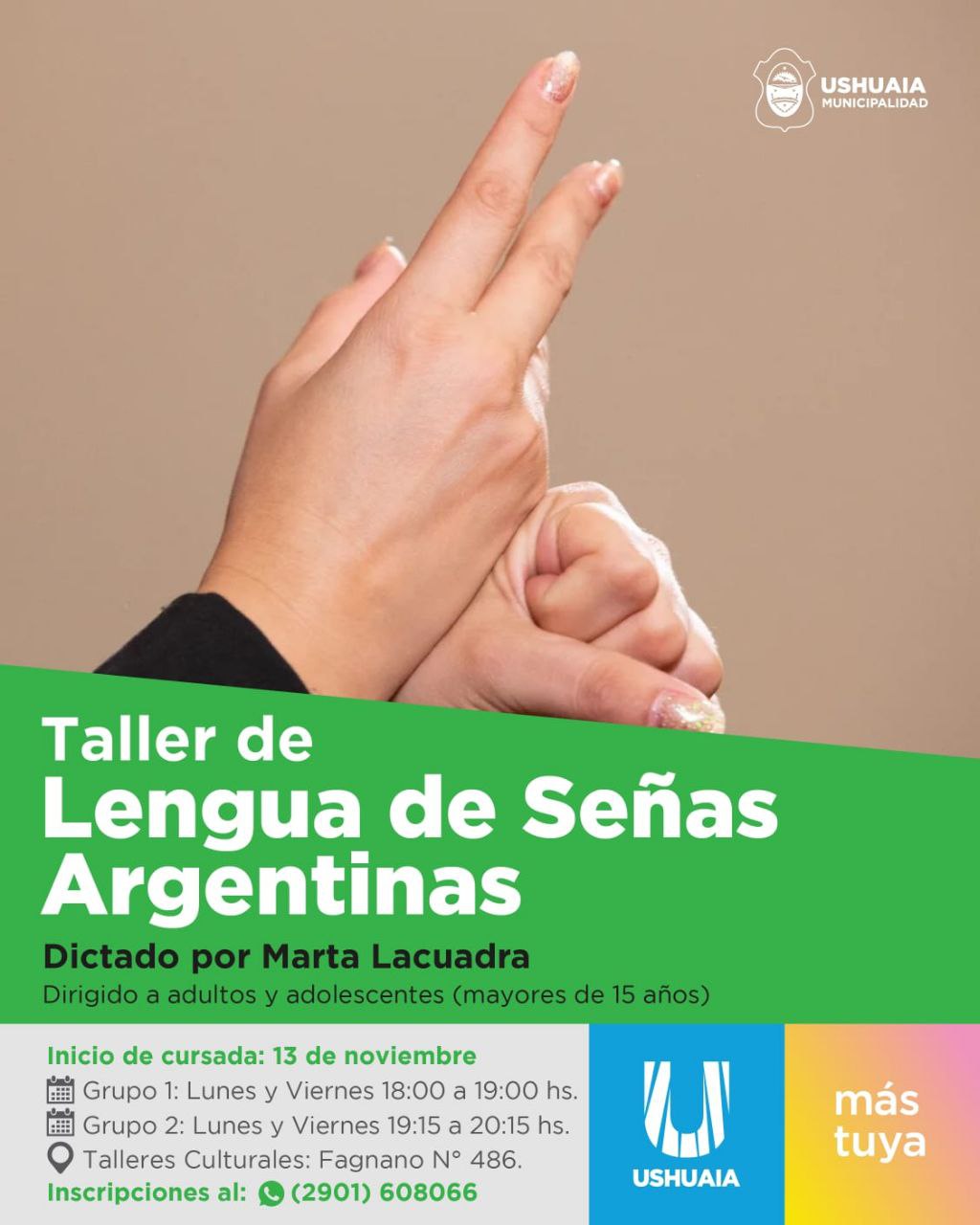 La propuesta municipal, que estará dictada por la tallerista y facilitadora de lengua de señas Marta Lacuadra, está destinada a adultos y adolescentes mayores de 15 años brindando herramientas para la comunicación con personas sordas, hipoacúsicas y con trastornos del habla, sensibilizando asimismo sobre la temática.