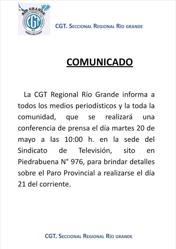 Mientras siguen las dudas por la creación del Comando Unificado Tierra del Fuego y su protocolo antipiquetes, la CGT Río Grande con los distintos gremios que la conforman, encabezará este martes una conferencia de prensa desde las 10:00 AM en el Sindicato de Televisión de Río Grande donde brindarán detalles de lo que será el paro provincial que alcanzará a las actividades del ámbito público y privado.