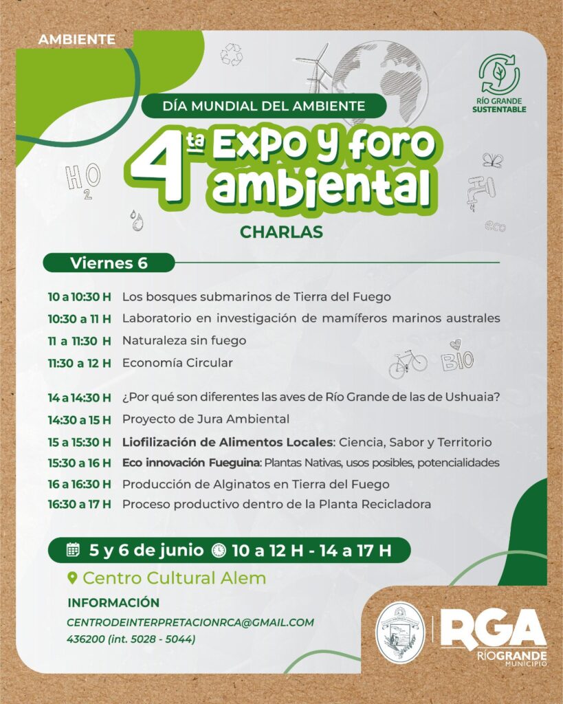 Posteriormente, el COA Ushuaia disertará sobre “¿Por qué son diferentes las aves de Río Grande de las de Ushuaia?”; luego seguirán los estudiantes del colegio EMEI que expondrán sobre el proyecto de “Jura Ambiental”. Continuará el grupo de Química Aplicada al Ambiente, los Alimentos y el Desarrollo Sostenible de la UTN, con la charla “Liofilización de alimentos locales: ciencia, sabor y territorio”. Luego, Gustavo Varela -también de la UTN- presentará “Ecoinnovación fueguina: plantas nativas, usos posibles y sus potencialidades”. Más tarde, el grupo Alginatos de la UTN presentará “Producción de alginatos en Tierra del Fuego”. El cierre de la jornada estará a cargo de la empresa Ingenio Verde con la charla sobre el “Proceso productivo dentro de la planta recicladora”.