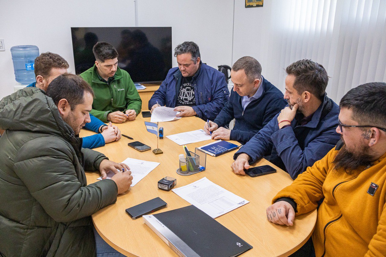 El secretario de Gobierno Gastón Díaz, junto a representantes del gremio S.I.T.O.S, entre ellos Diego del Estal, Matías Calderón, Daniel Villafañe; Leandro Vera y Miguel Solís acordaron una nueva recomposición salarial para los trabajadores y trabajadoras municipales de Obras Sanitarias. También estuvo presente en la firma el subsecretario de Finanzas, Nicolás Giordano.